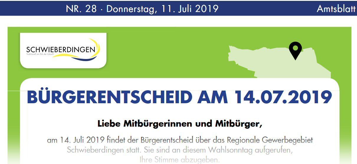 Die_Gemeindeordnung Baden-Württembergs sieht in §21 (GemO §21) zwei Wege für die Durchführung eines Bürgerentscheids vor. So hätte der Gemeinderat den regionalen Gewerbeschwerpunkt beschließen können, was die Gegner dann in einem Bürgerbegehren hätte anfechten können. Im Rahmen dieses Bürgerbegehrens hätten diese u.a. die Kosten angeben müssen, die sich daraus ergeben, und die Gemeinde hätte ihnen die dafür notwendigen Auskünfte geben müssen. Wäre der Gemeinderat dann auf die Forderungen nicht eingegangen, hätte ein Bürgerentscheid durchgeführt werden müssen, zu dem die Gemeinde in einer Veröffentlichung den Vertretern des Bürgerbegehrens in gleichem Umfang Raum zur Information hätte einräumen müssen.